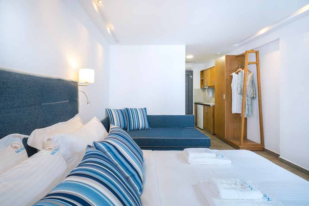 The quadruple studio is an open plan studio on the first floor that has a double bed and a double sofa bed. The studio is spacious elegantly decorated and can accommodate up to four people. The studio has an en-suite bathroom and several amenities that…
